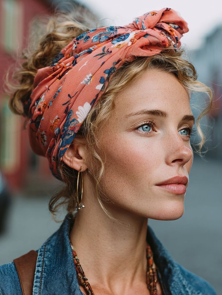 برای یه لُک بوهمیایی که حس پاییز رو فریاد می‌زنه، دستمال سر با طرح‌های گل‌دار یا برگ‌های پاییزی رو انتخاب کنید.