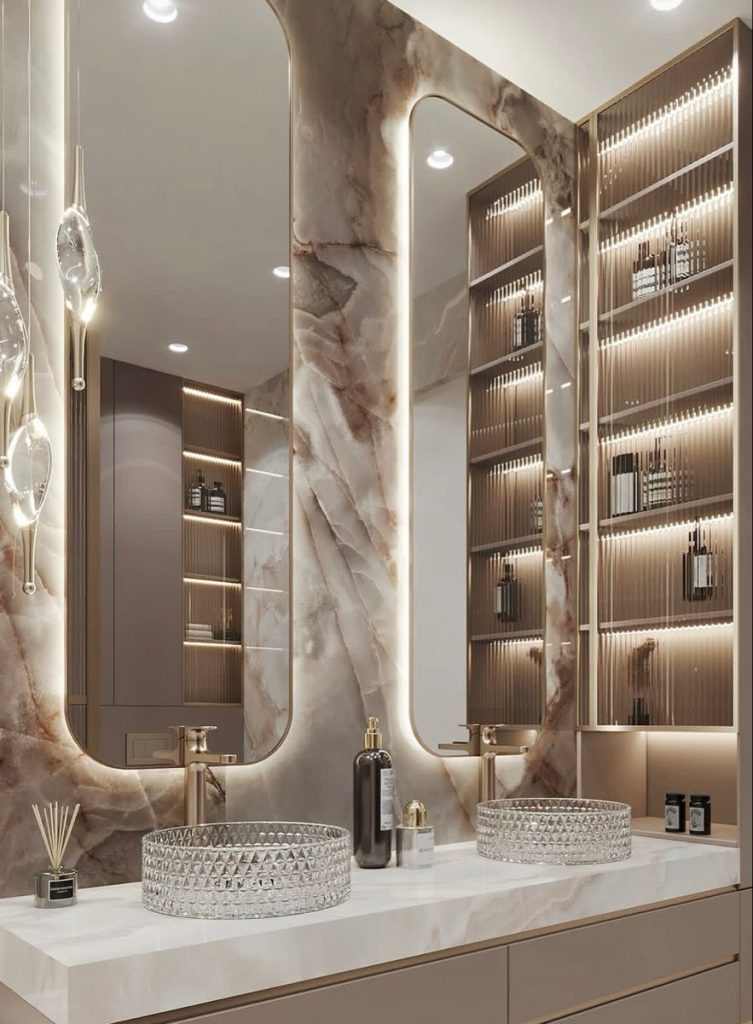 طرح خطی یا L برای فضاهای کوچک انتخاب کنید. wet room با شیشه بدون فریم اضافه کنید؛ طبق Zillow، ۳۰% حمامها اسپا-مانند هستند. آینههای گرد یا هوشمند، وان مستقل با پایه چوبی. فناوری: دوشهای rainfall و شیرآلات لمسی. برای ترند Japandi، خطوط تمیز و لبههای گرد استفاده کنید. در ایران، اپن با سرویس بهداشتی ترند است، اما جداسازی حفظ شود.