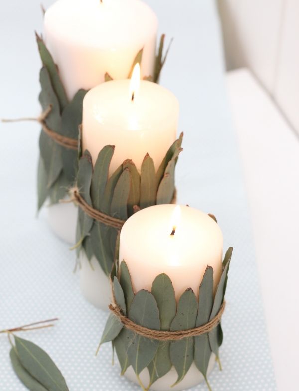 - با چسب حرارتی یا مایع، برگها رو به صورت پراکنده یا الگوهای منظم دور شمع بچسبونید.