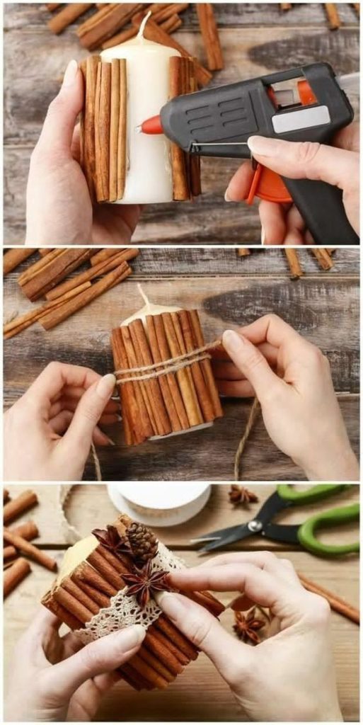 - فایده: عطر دارچین استرس رو کم میکنه و حس پاییزی میده. نکته: از چسب حرارتی کم استفاده کنید تا شمع موقع سوختن ایمن باشه.