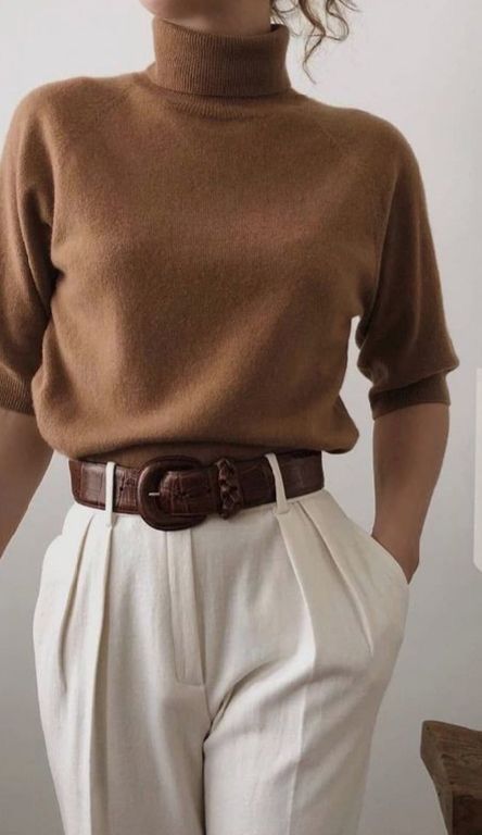 - برای زنان: کمربند چرم قهوهای روی مانتو گشاد با شلوار وایدلگ.