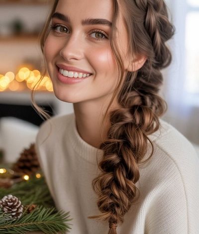 • چطور ببافی؟ فقط قسمت بالای سر (نزدیک پیشونی) رو با بافت سه‌تایی یا حصیری بباف و بقیه موها رو باز بذار. می‌تونی با روبان مخمل قهوه‌ای یا گیره‌های پاییزی تزئین کنی.