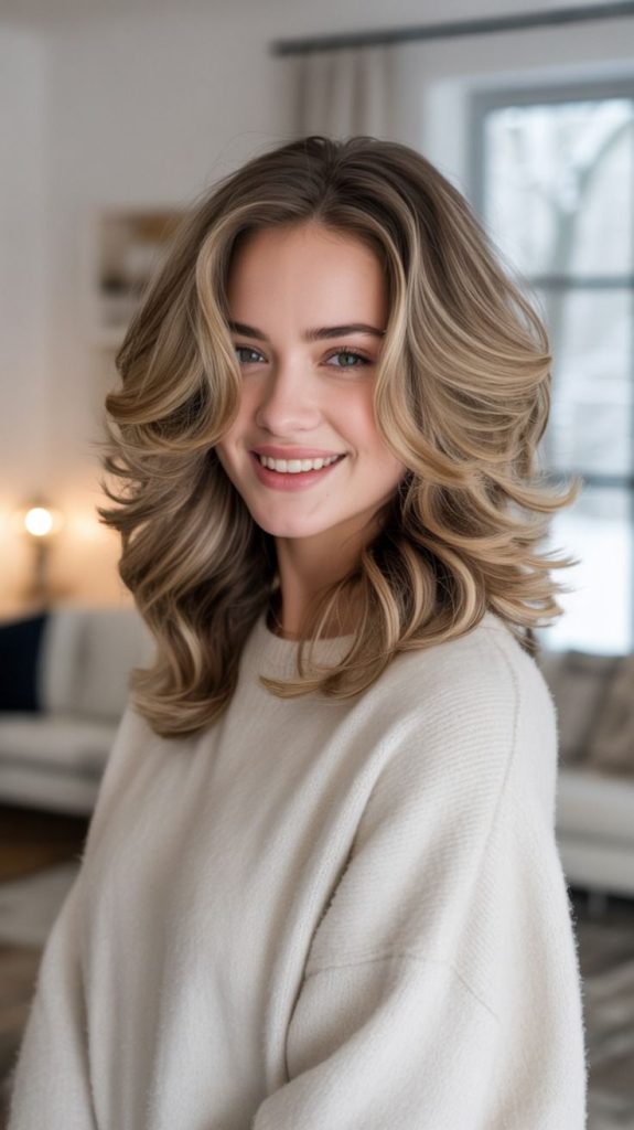 موهای بلند با لایه‌های نرم و چتری‌های پرده‌ای که دو طرف صورت رو فریم می‌کنن، برای یه استایل رمانتیک و پاییزی عالیه.