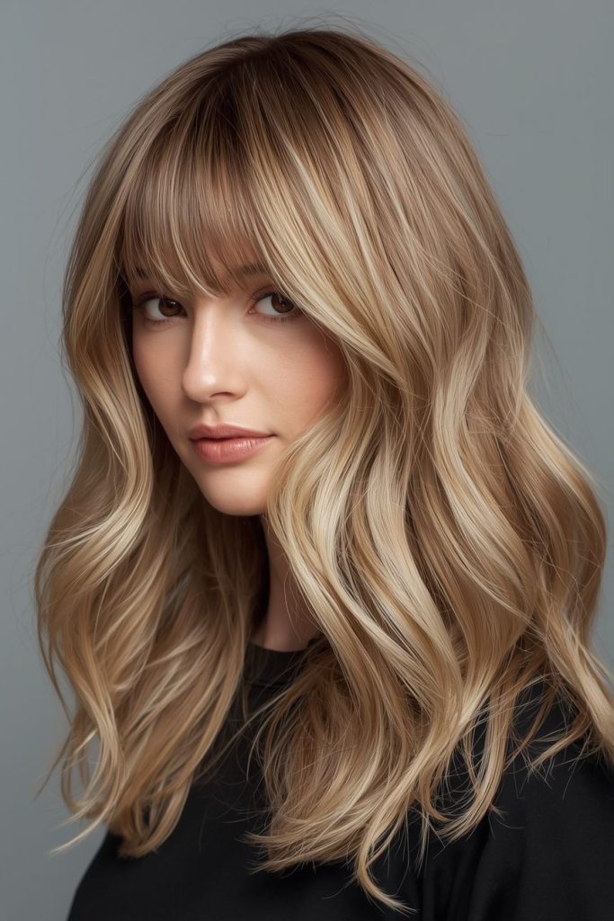 ۳. موهای بلند لایه‌دار با چتری پرده‌ای (Long Layered with Curtain Bangs): رمانتیک و پاییزی