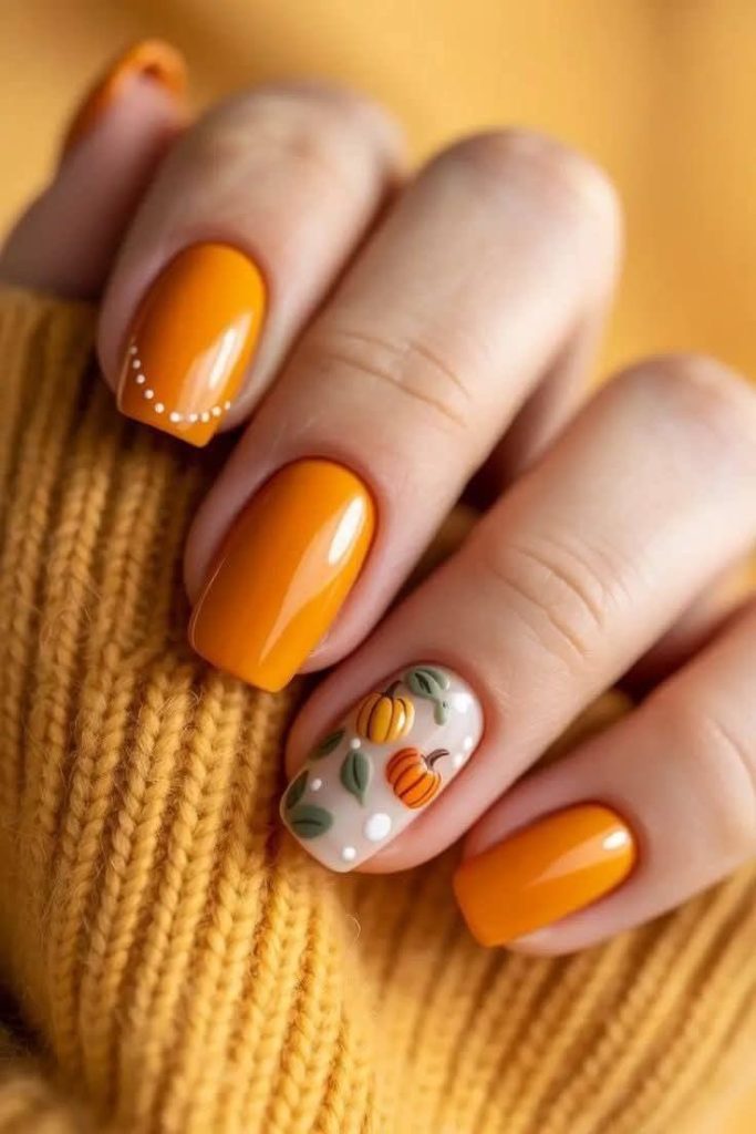 ۴. ناخنهای اکلیلی با تم کدو حلوایی: درخشان و فصلی