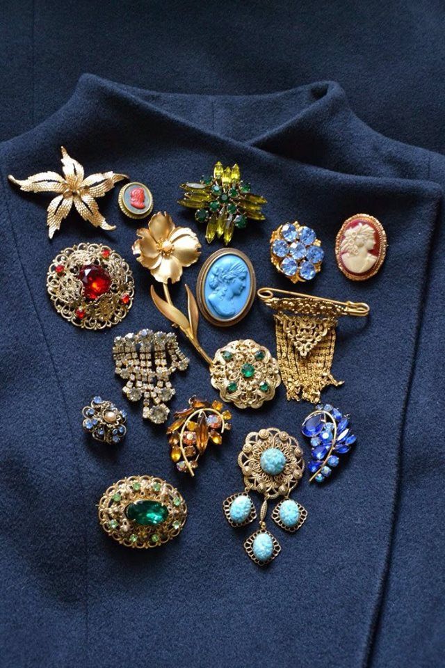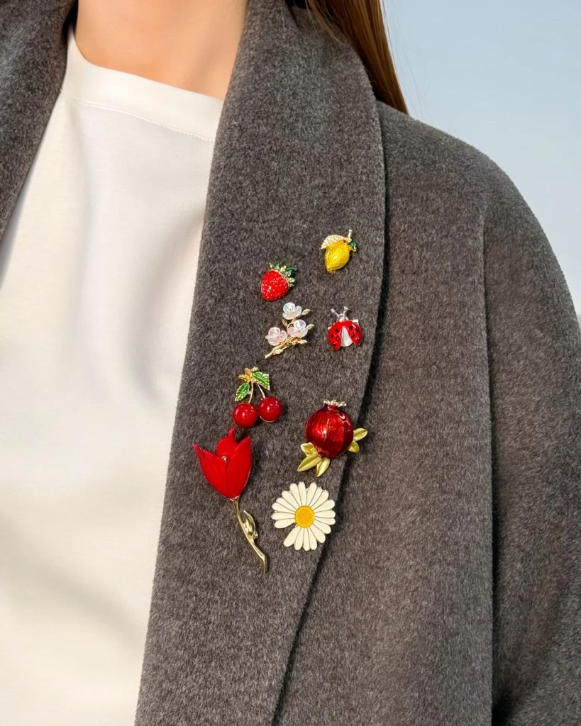 ۲. بروشهای بزرگ (Brooches) – فلزی یا پاییزی (برگ، گل)، روی ژاکت بذار. ست با کت بمباف.