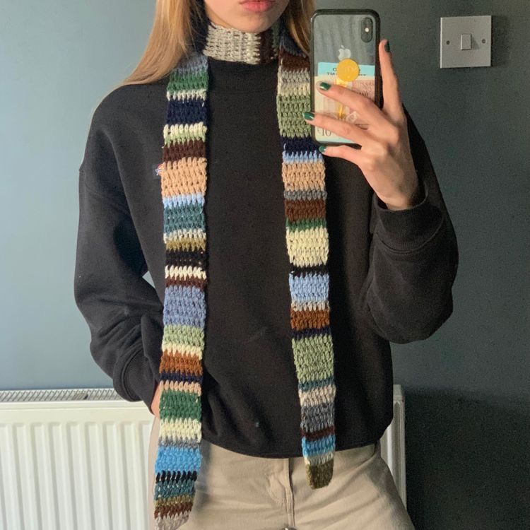 ۱. شال نازک (Skinny Scarves) – Y2K revival، دور گردن یا کیف ببند. ست با هودی سفید + جین.