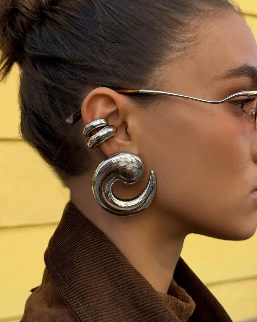 ۸. گوشوارههای مجسمهای (Sculptural Earrings) – بزرگ و فلزی، برای لمس لوکس. ست با مانتو بژ.