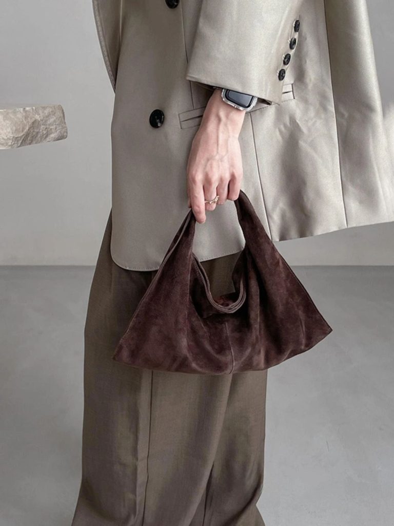 ۶. کیف سوئد قهوهای (Suede Bags) – بوهو و ترندی، از Coach یا Chloé. ست با جین + بلوز لایهدار.