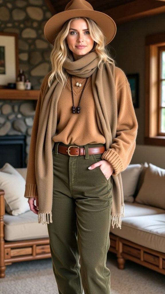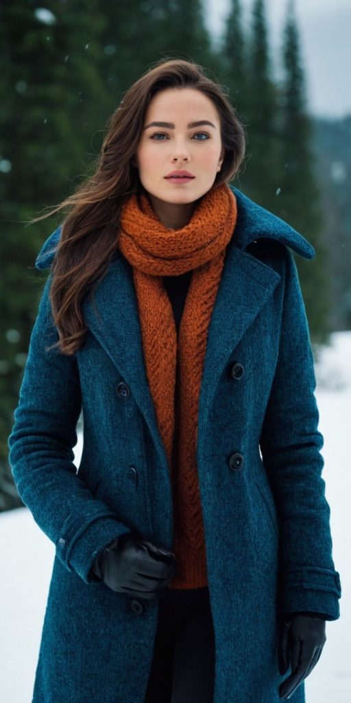 • برای زنان: شال پشمی سنتی با مانتو گشاد قهوه‌ای، شلوار وایدلگ مشکی و بوت‌های کوتاه.